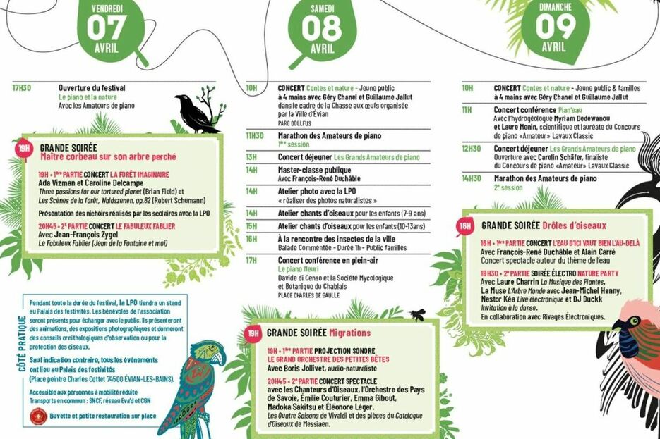 Le festival prendra place au Palais des festivités pour les concerts en salle mais également dans les parcs et jardins de la ville thermale pour des concerts décor nature ou les balades ornithologiques. Plus de soixante pianistes, amateurs et professionnels, une trentaine d’artistes musiciens, comédiens, vidéastes.. et siffleurs d’oiseaux, et une dizaine d’intervenants scientifiques et naturalistes partageront la scène musicale et ornithologique du festival !